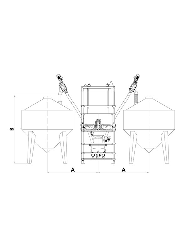 Wenn der Big Bag unten geschlossen ist und keine Entleerungsöffnung hat, ist es möglich, den Übergabetrichter mit einem geeigneten Schneidsatz mit einem seitlichen Erhöhungskasten zu integrieren, der den beim Schneiden des Big Bag selbst entstehenden Staub auffängt.